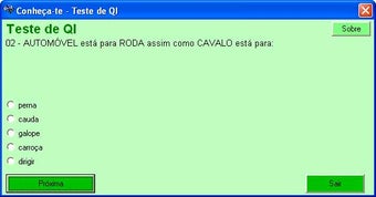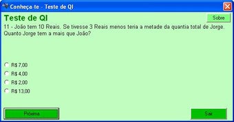 O Teste do Quociente Intelectual é um aplicativo simples que, mediante perguntas, permite medir o seu quociente de inteligência (QI). Não é nada científico, mas é divertido, grátis e está em português.